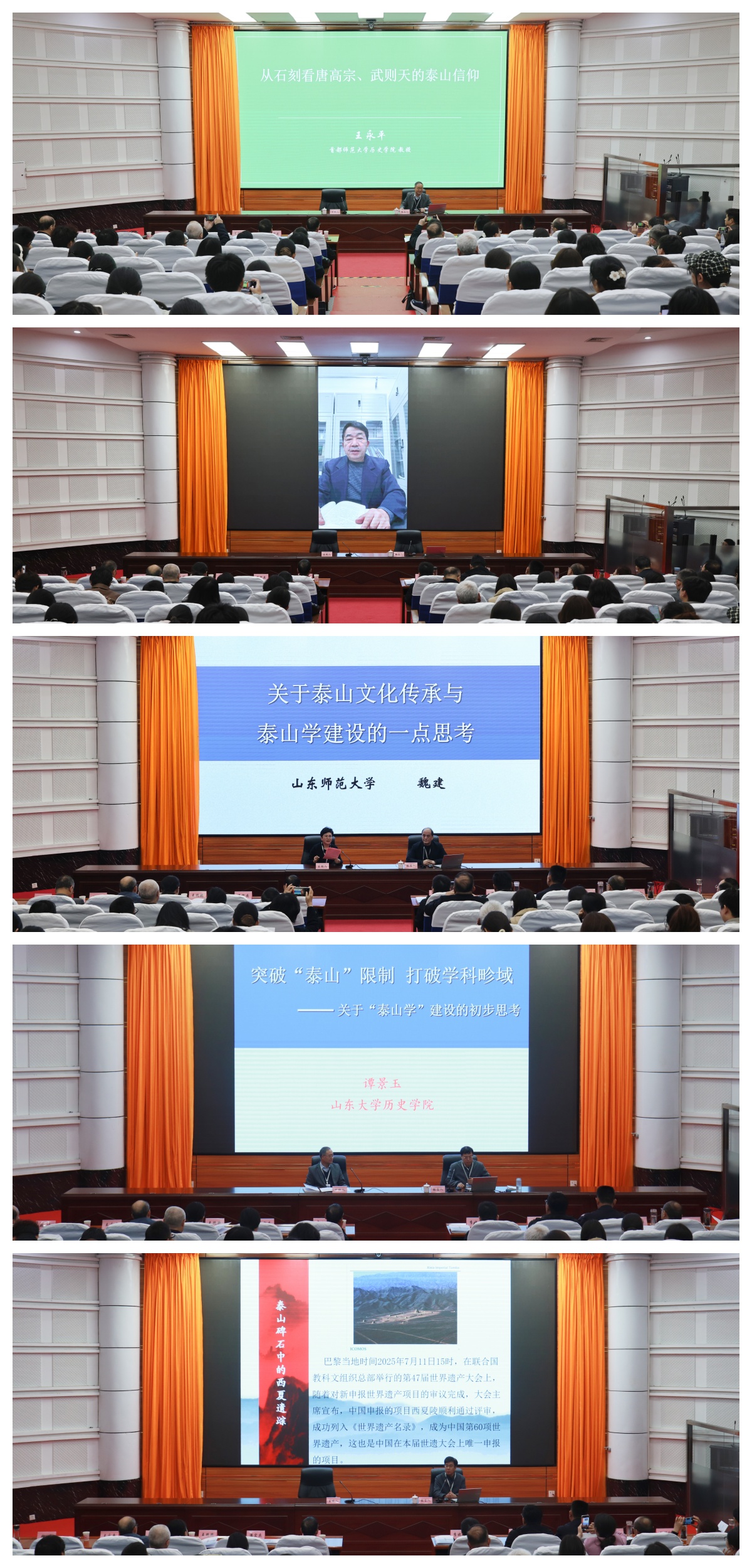 主旨报告阶段,首都师范大学王永平教授、中国社会科学院王延中研究员、山东师范大学魏建教授、山东大学谭景玉教授、泰山学院周郢教授聚焦泰山文化研究分别作主旨发言。分会场研讨阶段,与会专家紧紧围绕泰山文化“两创”与中华优秀文化传承发展、“泰山学”学科体系建设研究、泰山文旅深度融合与区域高质量发展三个主题进行深入探讨。