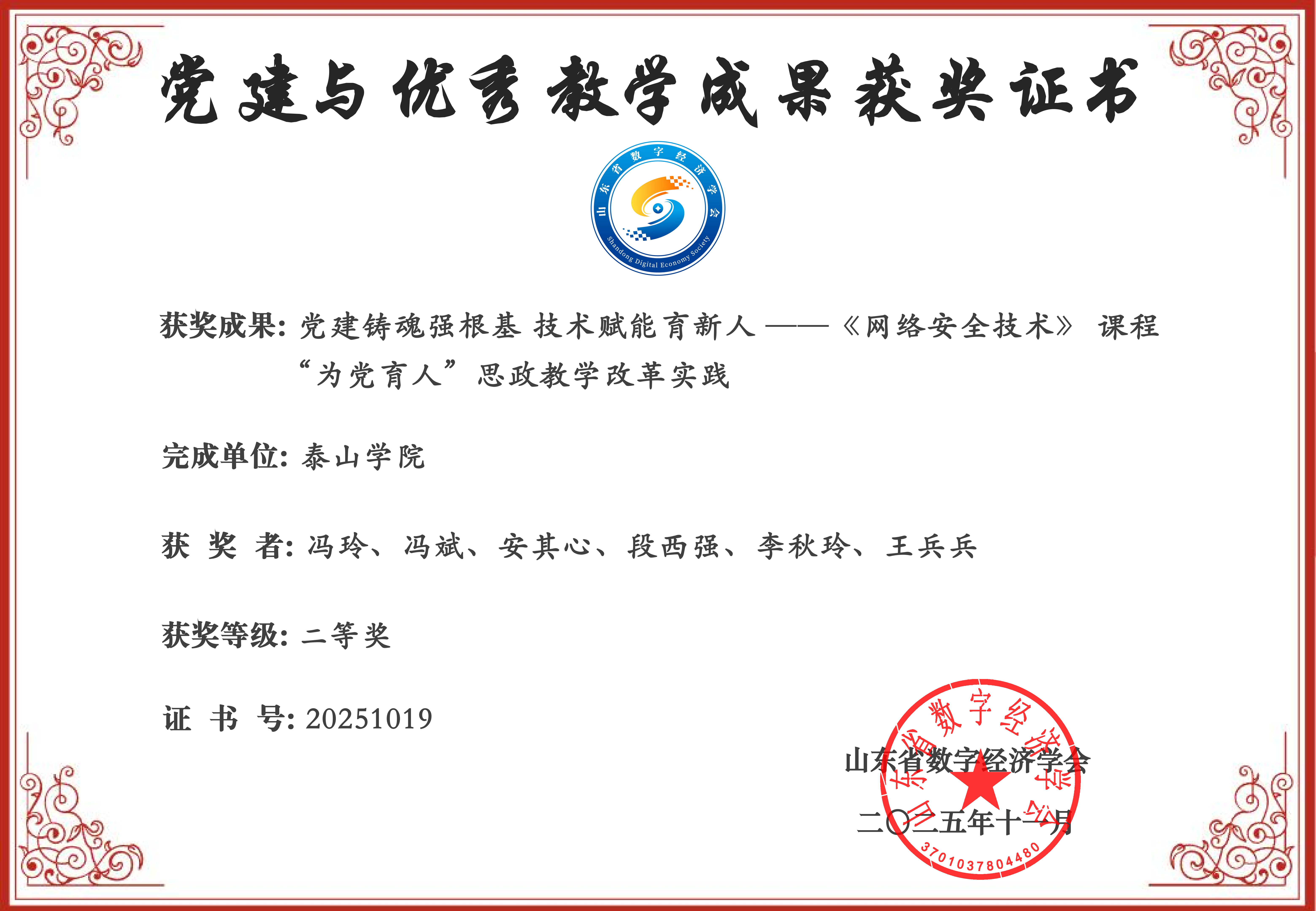 张国锋团队申报的《党建引领下数字经济产业智慧课程建设与教学实践》荣获特等奖,该成果立足数字经济产业人才及岗位需求,坚持党建引领和AI赋能双轮驱动,探索了智慧课程建设模式,构建了特色教学体系。冯玲团队申报的《党建铸魂强根基技术赋能育新人——〈网络安全技术〉课程“为党育人”思政教学改革实践》荣获二等奖,该成果将党建思政与专业教学深度融合,创新了网络安全人才培育模式。