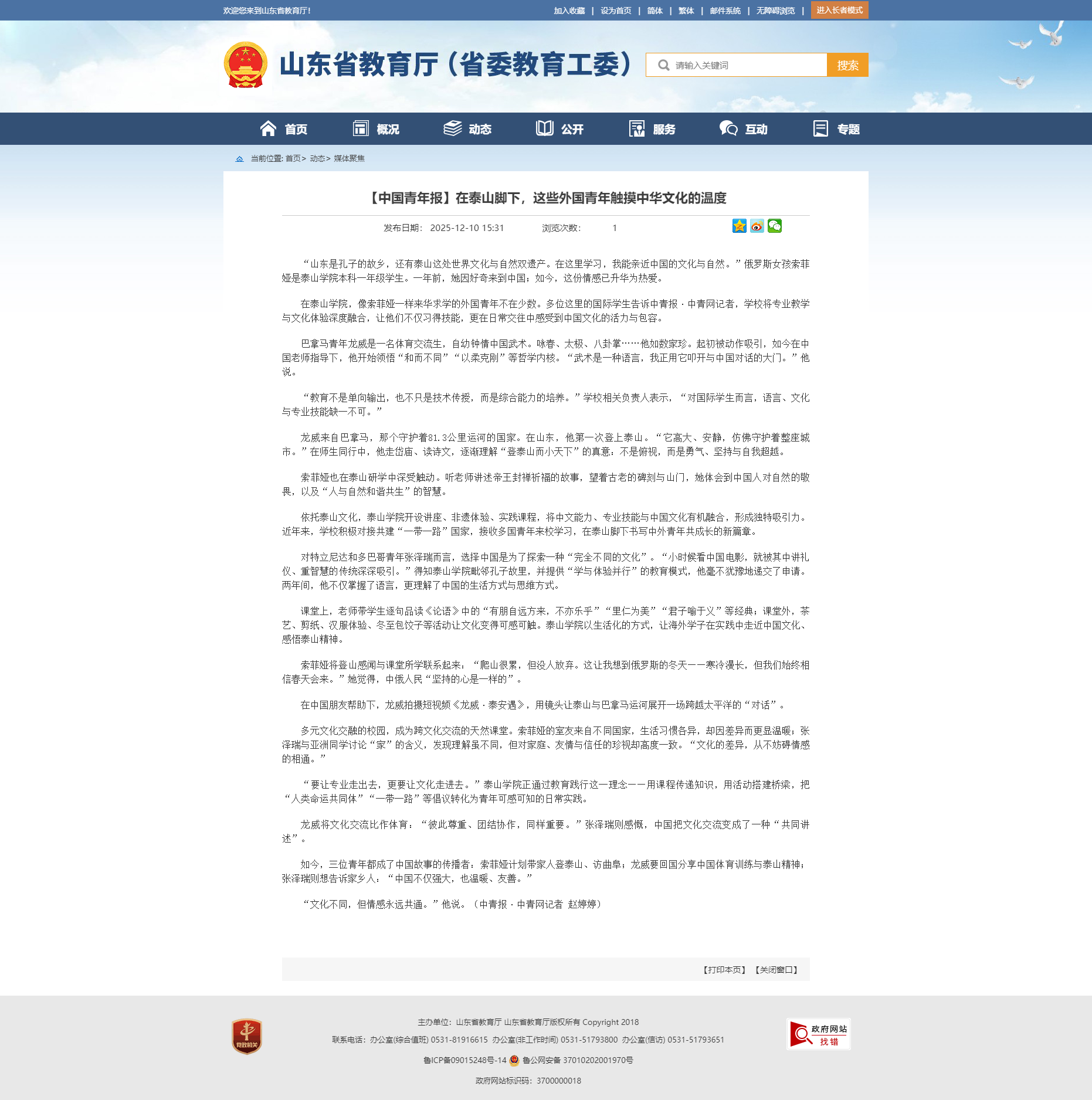 12月10日,《中国青年报》以“在泰山脚下,这些外国青年触摸中华文化的温度”为题,在国际版专题报道了学校深耕中华优秀传统文化教育,以泰山为媒架构中外文化交流桥梁,积极探索特色国际化办学的生动实践。全文如下: