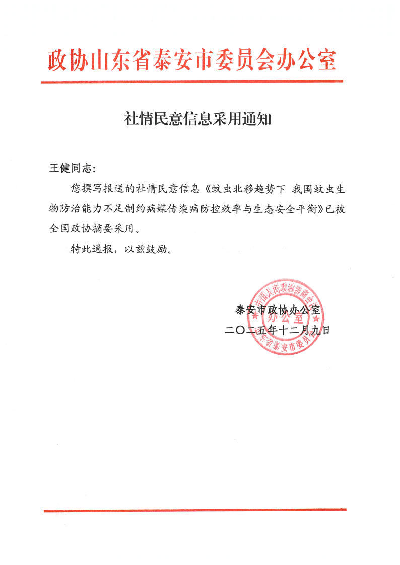 近日,学校物理与电子工程学院王健教授(九三学社泰山学院支部副主委)提报的社情民意信息《蚊虫北移趋势下我国蚊虫生物防治能力不足制约病媒传染病防控效率与生态安全平衡》获全国政协摘要采用。
