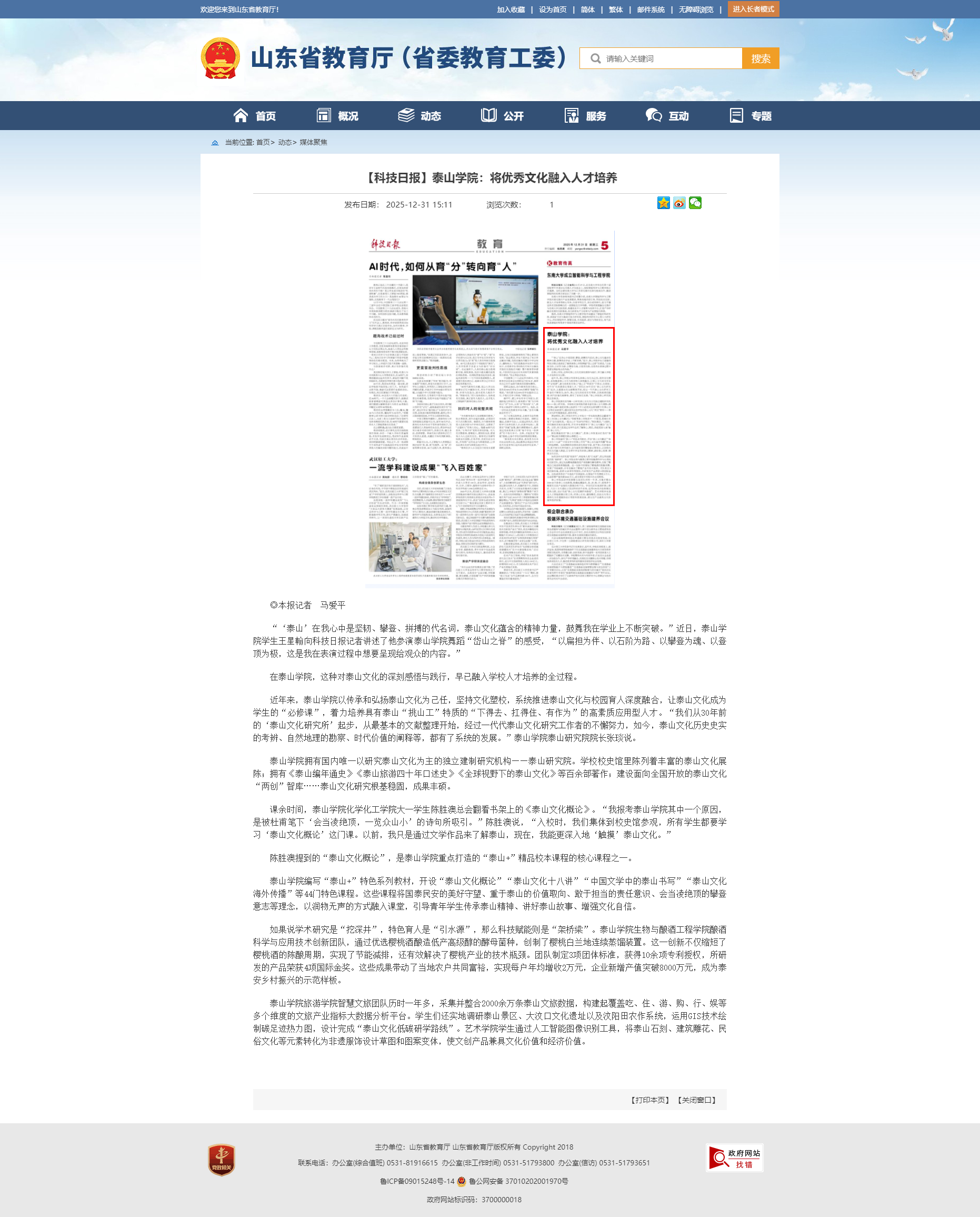 12月31日,《科技日报》以“泰山学院:将优秀文化融入人才培养”为题,在教育版专题报道了学校将泰山文化融入人才培养全过程的实践探索及育人成效。