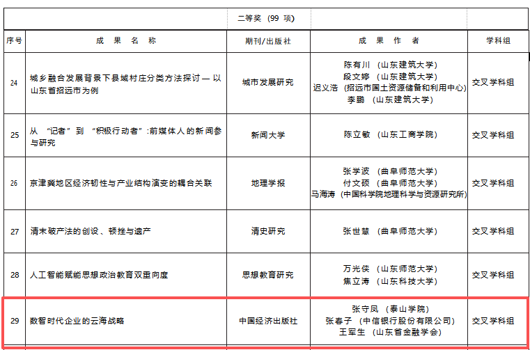 12月30日,山东省社会科学优秀成果奖评选委员会办公室公布了山东省第三十七届社会科学优秀成果奖获奖成果名单,学校2项成果获批。其中,张守凤教授提报的著作《数智时代企业的云海战略》荣获二等奖,文学与传媒学院邵妍教授提报的著作《<尚书孔传>训诂研究》荣获三等奖。