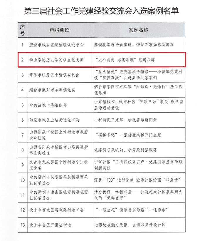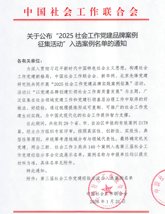 活动现场,公布了“机关党建类、三新两企党建类、社会工作类”入围案例,历史学院学生党支部申报的“史心向党 志愿领航”案例,从29个省、市、自治区的2178篇有效案例中脱颖而出,成功入选2025社会工作党建品牌案例。