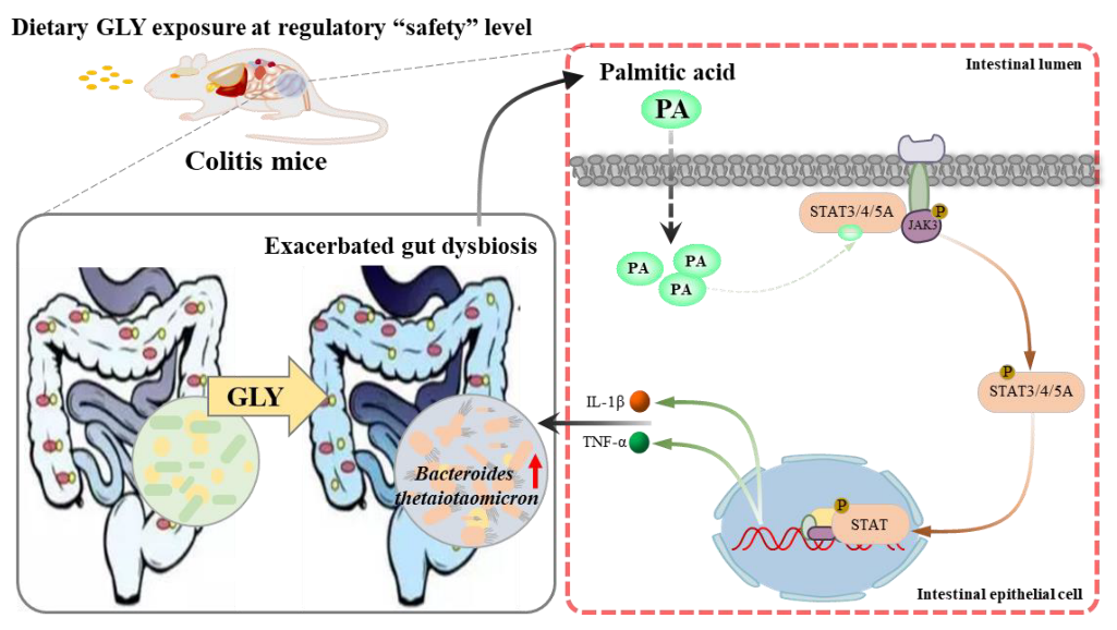 草甘膦毒性问题一直是存在争议。2015年,国际癌症研究机构将草甘膦归类为“可能对人类致癌物”,但欧洲化学品管理局声称“草甘膦不应被分类为致癌物(也不是致突变物或对生殖有毒)”,2023年,欧洲食品安全局制定可接受日摄入量安全限值。但该剂量是否会影响患者疾病进展仍然是个谜。因此,本研究探讨了监管“安全”剂量草甘膦暴露对结肠炎进程的影响,结果发现,长期监管“安全”剂量暴露显著增加结肠炎小鼠肠道产棕榈酸菌Bacteroides thetaiotaomicron丰度,导致肠道内棕榈酸大量蓄积,引发结肠上皮细胞JAK-STAT信号通路活化,进而加重结肠炎。