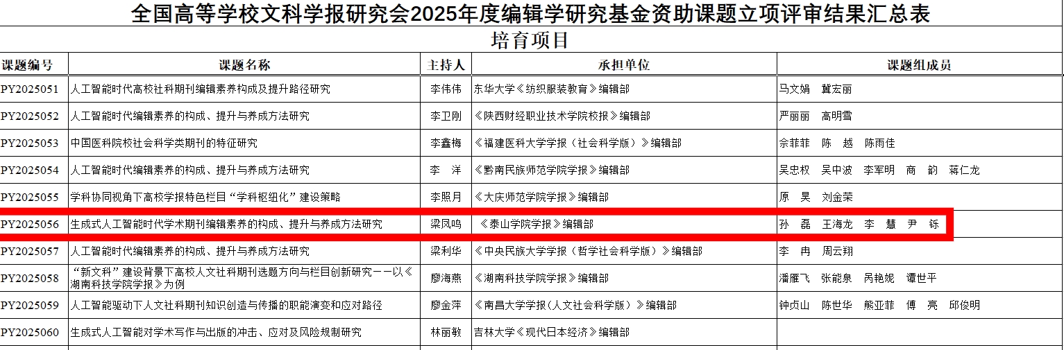 近日,全国高等学校文科学报研究会公布2025年度编辑学研究课题立项结果,学校学报编辑部申报的《生成式人工智能时代学术期刊编辑素养的构成、提升与养成方法研究》成功入选。