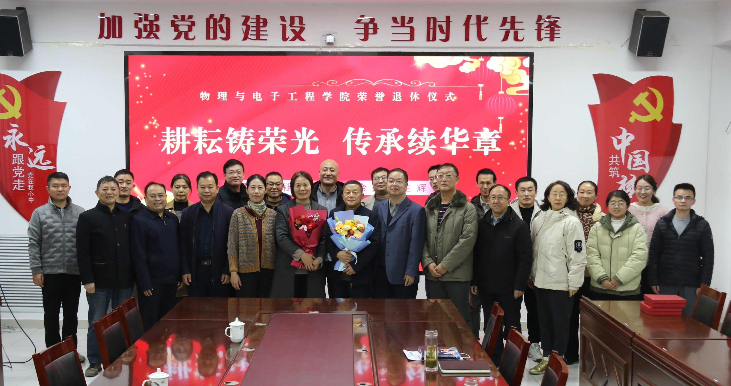12月3日下午,物理与电子工程学院在二号综合楼会议室为王春玲和周学利老师举办“耕耘铸荣光·传承续华章”荣誉退休仪式。两位退休老师和学校离退休工作处相关负责人、学院领导班子、教师代表参加活动,学院党委主要负责人主持仪式。
