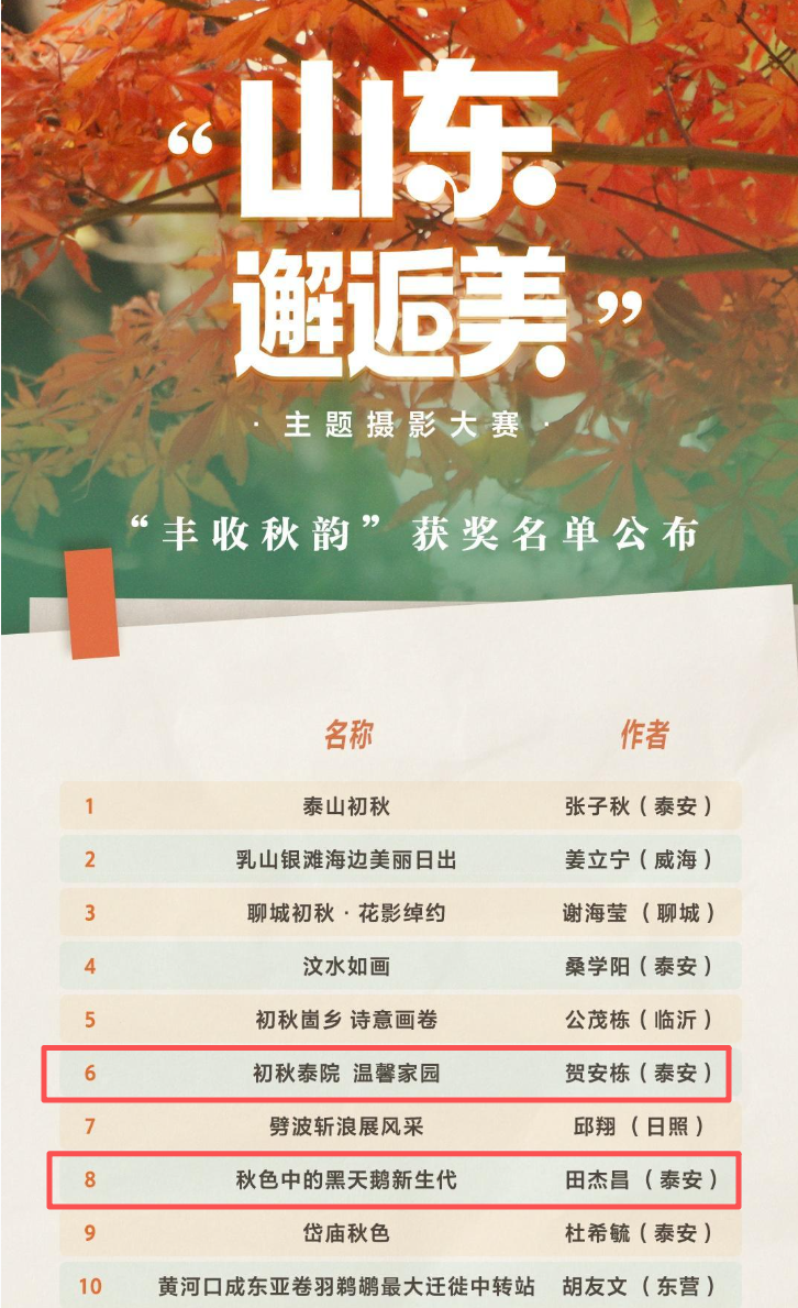近日,由大众日报・大众新媒体大平台、“学习强国”山东学习平台联合主办,大众日报记者部、“学习强国”山东各地市学习平台等单位承办的“山东邂逅美”主题摄影大赛“丰收秋韵”公布了评选结果。我校田杰昌作品《秋色中的黑天鹅新生代》、贺安栋作品《初秋泰院 温馨家园》荣获优秀作品奖。