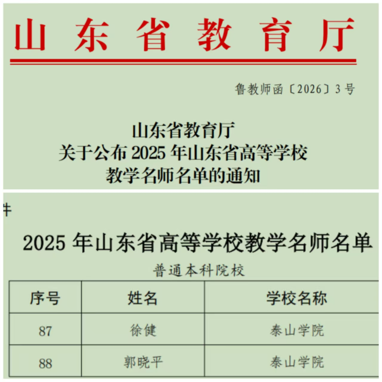 近日,山东省教育厅公布了2025年度山东省高等学校教学名师认定名单,学校旅游学院徐健教授、文学与传媒学院郭晓平教授成功入选,荣获“山东省高等学校教学名师”称号。