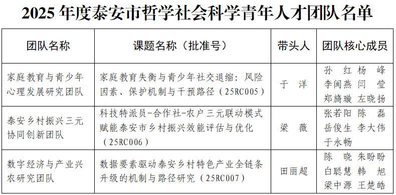 10月22日,泰安市社会科学界联合会发布《关于公布2025年度泰安市哲学社会科学青年人才团队名单的通知》,学校推荐的“家庭教育与青少年心理发展研究团队”“泰安乡村振兴三元协同创新团队”“数字经济与产业兴农研究团队”获批立项,立项数量居全市各推荐单位首位。 据悉,泰安市社会科学界联合会为深入贯彻落实习近平总书记关于哲学社会科学的重要论述,进一步培育壮大全市哲学社会科学人才队伍,此次共立项建设14个哲学社会...