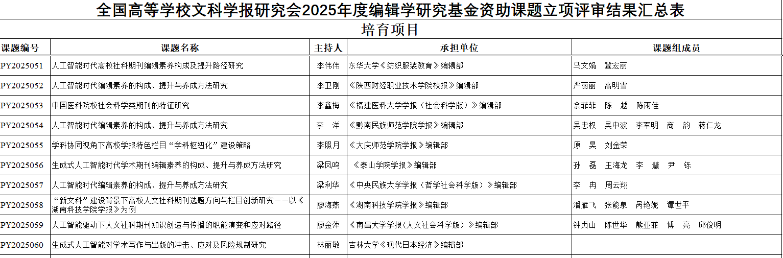 近日,全国高等学校文科学报研究会公布2025年度编辑学研究课题立项结果,学校学报编辑部申报的《生成式人工智能时代学术期刊编辑素养的构成、提升与养成方法研究》成功入选。 全国高等学校文科学报研究会此次课题申报,旨在助力中国特色哲学社会科学自主知识体系建设,紧跟学术期刊国际化、数字化发展步伐,推进编辑学学科高质量发展。经研究会学术工作委员会评审与研究会审核批准,最终确定立项课题名单。当前,生成式人工智...