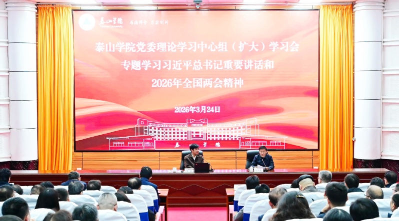 3月24日下午,学校在国际交流中心召开党委理论学习中心组(扩大)学习会,专题学习习近平总书记重要讲话和2026年全国两会精神。学校党委副书记、校长彭淑贞主持会议并讲话。会上,全国人大代表、学校泰山研究院周郢教授以《宣两会精神 弘泰山文化》为题,传达习近平总书记在全国两会期间的重要讲话和2026年全国两会精神,并分享自己作为人大代表履职尽责的情况和学习体会。他表示,通过参加人大会议,不仅提高了政治认知与理论水平...