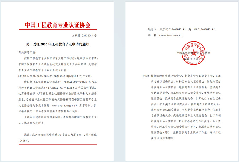 近日,中国工程教育专业认证协会发布《关于受理2025年工程教育认证申请的通知》(工认协〔2026〕4号),学校软件工程、化学工程与工艺专业顺利通过认证申请受理。 工程教育专业认证工作是加强学校工科专业内涵建设的重要抓手,也是学校打造“工科亮色”办学特色的关键举措。学校高度重视工科专业建设,制定《关于进一步加强新工科建设的指导意见》《主要教学环节质量标准》《人才培养达成情况评价管理办法》等制度文件,深入...